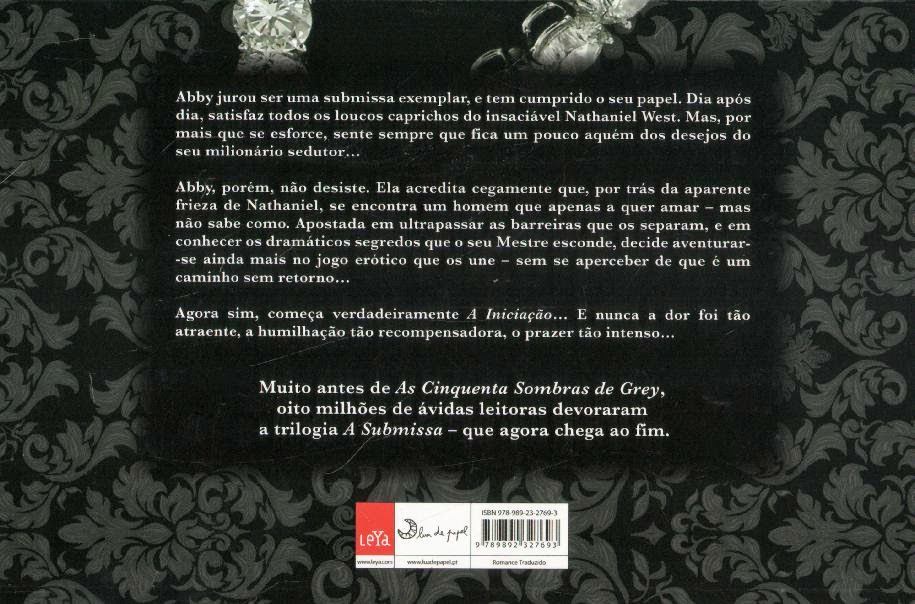 Será que um Mestre pode aprender a amar? O segundo livro da escaldante trilogia A Submissa Nathaniel West é quem faz as regras, e as regras são claras: nunca aceitar uma submissa inexperiente. Mas quando o sedutor milionário conhece Abby, comete o primeiro erro: decide aceitar a jovem e disponível candidata e submetê-la a um teste, na sua casa de campo, durante todo o fim-de-semana... Ao subestimar a nova submissa, Nat dá o segundo passo em falso. Porque ela não sabe, mas quer aprender. É ingénua, mas sabe o que quer. E quer ultrapassar todas as barreiras, todos os tabus e descobrir o coração que verdadeiramente se esconde por trás da devastadora frieza de Nat. Começa o jogo. Perigoso, erótico, sensual. E desta vez é Nathaniel quem nos conta a história - e é ele quem deixa cair, uma após outra, as máscaras atrás das quais se protege. Sempre dilacerado por um dilema: ele quer Abby por inteiro, quer conquistá-la. Mas não sabe como, e tem de aprender, mesmo quebrando todas as regras. Mas até que ponto ele se deixará levar pelo desejo, quando estão em causa os terríveis segredos do seu passado?